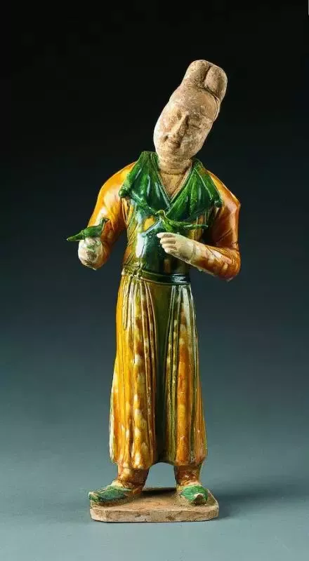 頭戴幞頭,微向左偏,面目清秀,身著翻領(lǐng)胡服,腰系帶。雙手各持一小鳥作調(diào)耍狀,足穿尖頭長靴。通體施釉,色彩鮮艷,形象悠閑瀟灑,調(diào)戲小鳥時(shí)喜形于色的神態(tài)得到了充分的體現(xiàn)。反映了當(dāng)時(shí)多姿多彩的生活內(nèi)容,具有濃郁的時(shí)代氣息。