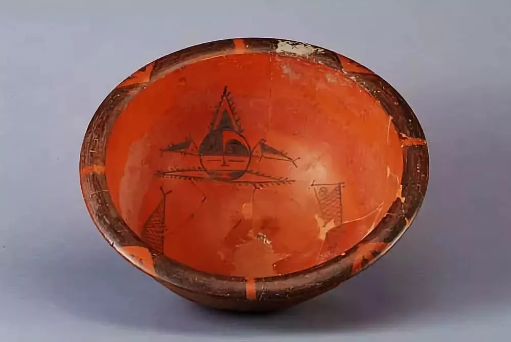 盆高16.5厘米,口徑39.5厘米,在陶盆內(nèi)壁,繪有對(duì)稱的兩個(gè)人面和兩條魚紋。該器物1955年被發(fā)現(xiàn),出土點(diǎn)在半坡遺址居住區(qū)內(nèi)。這也是半坡遺址首次發(fā)現(xiàn),完整的人面魚紋這種陶瓷圖案。