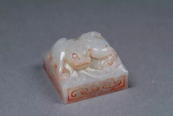 玉色純凈無瑕,晶瑩潤澤,玉質(zhì)堅(jiān)硬致密,無任何受沁現(xiàn)象。璽體為正方形,鈕為高浮雕的匐伏之螭虎,螭虎形象兇猛,體態(tài)矯健,四肢有力,雙耳后聳,尾部藏于云紋之中,背部陰刻出一條較粗的隨體擺動(dòng)的曲線。璽臺(tái)四側(cè)面呈平齊的長方形,并琢出長方形陰線框。因出土地點(diǎn)距漢高祖和呂皇后合葬的長陵約1公里,推測為呂皇后呂雉之物,是漢代皇后璽的唯一實(shí)物資料,彌足珍貴。