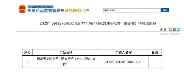9月27日,國家藥品監(jiān)督管理局政務(wù)服務(wù)門戶公布了1批次嬰幼兒配方乳粉產(chǎn)品配方注冊批件(決定書)待領(lǐng)取信息。信息包括雅培親護(hù)1款嬰幼兒配方奶粉