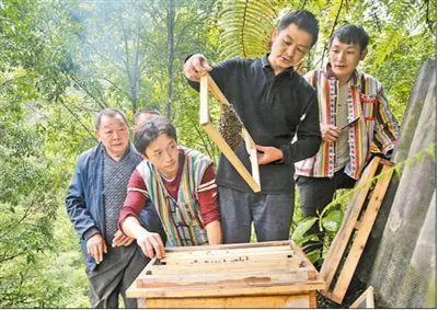 農(nóng)技專家(右二)給獨(dú)龍族群眾傳授規(guī)范養(yǎng)蜂技術(shù)。