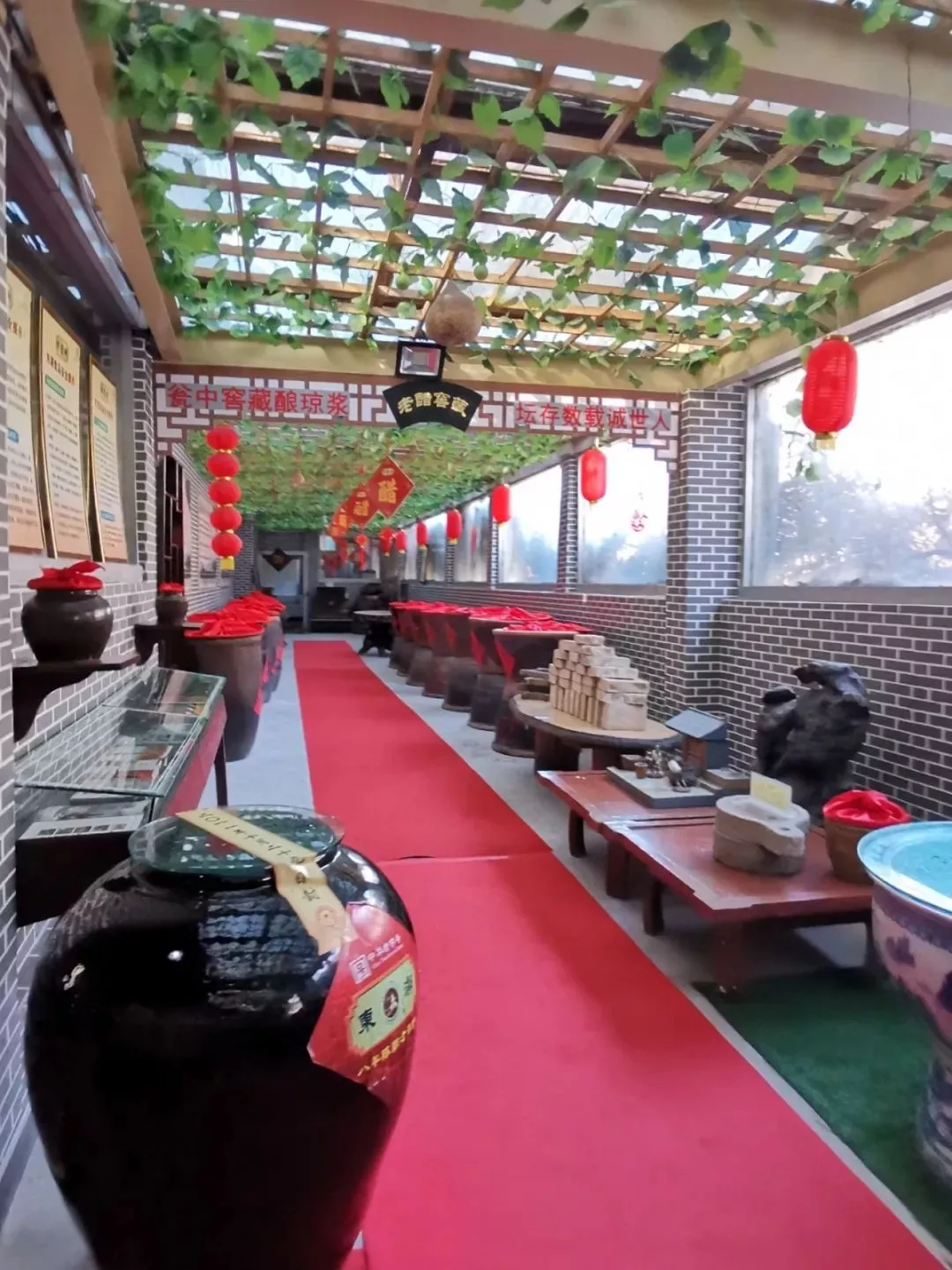 隨后是陳釀坊。在山西醋的釀造過(guò)程中,將剛釀出來(lái)的醋稱為新醋,新醋在自然狀態(tài)中陳釀一年以上才能被稱為老陳醋?!瓣愥剷?huì)蒸發(fā)出水分,水分中含有大量的醋酸菌之類的有益成分,這些成分溶解到空氣中,使這個(gè)陳釀房形成了一個(gè)天然的滅菌室,進(jìn)去走一圈一周不生病啊?!甭?tīng)著導(dǎo)游的話語(yǔ),我們依次走進(jìn)玻璃搭建的長(zhǎng)廊,濃郁的醋香依舊,日光透過(guò)玻璃映暖了扎在醋缸上的朱紅。