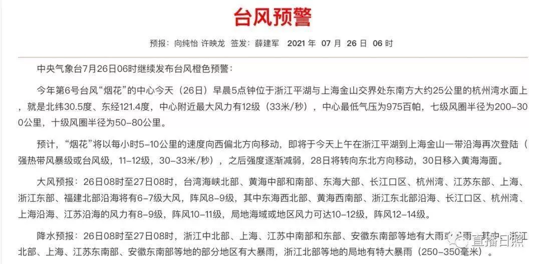 今年第6號臺風(fēng)“煙花”的中心今天(26日)早晨5點(diǎn)鐘位于浙江平湖上海金山交界處東南方大約25公里的杭州灣水面上,就是北緯30.5度、東經(jīng)121.4度,中心附近最大風(fēng)力有12級(33米/秒),中心最低氣壓為975百帕,七級風(fēng)圈半徑為200-300公里,十級風(fēng)圈半徑為50-80公里。
