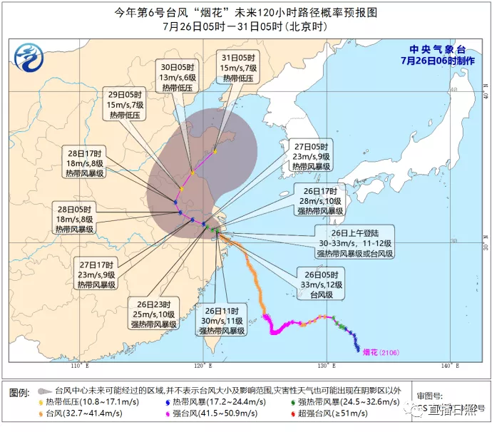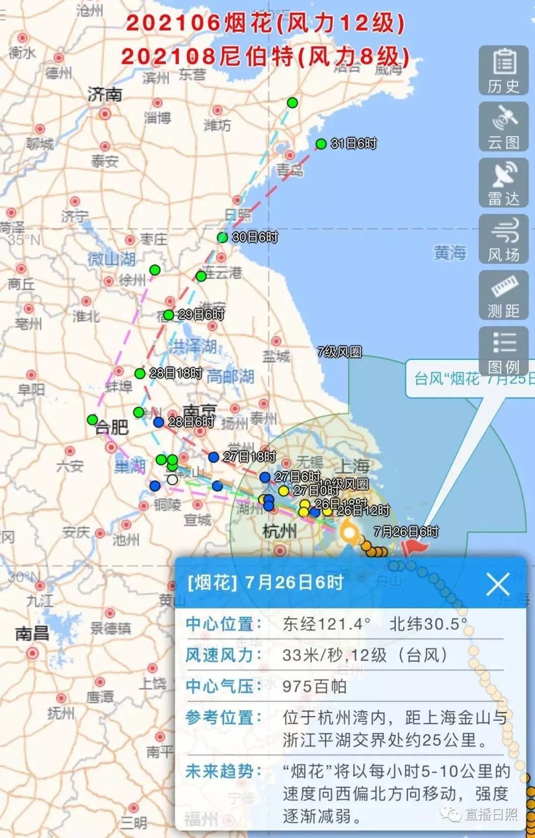 預(yù)計(jì),“煙花”將以每小時(shí)5-10公里的速度向西偏北方向移動(dòng),即將于今天上午在浙江平湖到上海金山一帶沿海再次登陸(強(qiáng)熱帶風(fēng)暴級或臺風(fēng)級,11-12級,30-33米/秒),之后強(qiáng)度逐漸減弱,28日將轉(zhuǎn)向東北方向移動(dòng),30日移入黃海海面。
