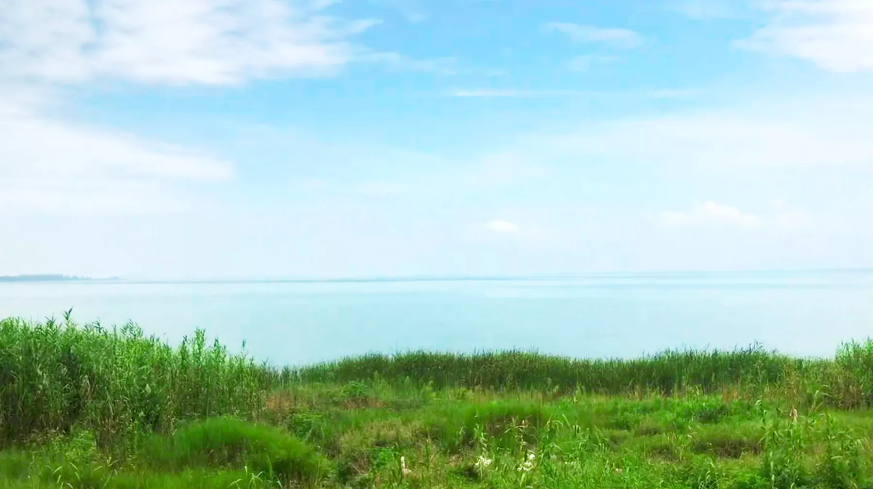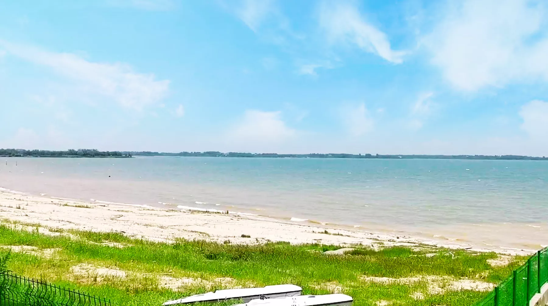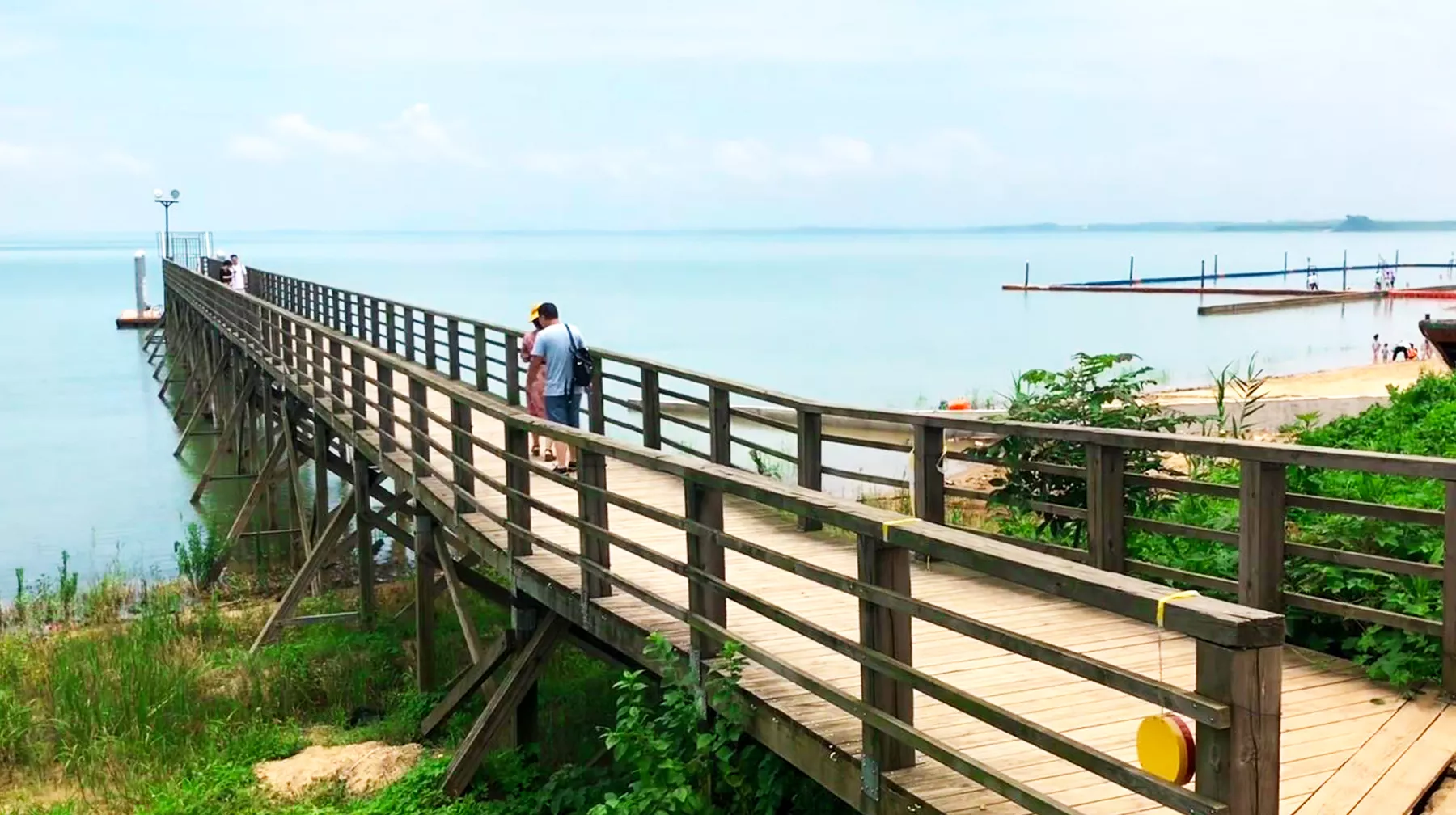 從長廊處走進沙灘浴場區(qū)域,首先看到的是一大塊蘆葦岸,長勢茂盛,點綴在湖區(qū)周邊,意境和諧。繼續(xù)沿著前方步行,又有一條長長的水上棧道橫亙在眼前,一頭連著陸地,一頭拓展到湖區(qū)上,粗看之下,像特意制作用來觀景的,但走到盡頭,有鐵門鎖著的一張水上平臺,有點類似快艇等船類靠岸的碼頭。不過,站在棧道上看湖景,到底是廣闊的意境,近處腳下的湖水,水質(zhì)清澈深邃,遠處的天空和湖面接壤一體,就斜角處的水岸邊沙灘全貌都看得一清二楚,是一個拍照的好地方。