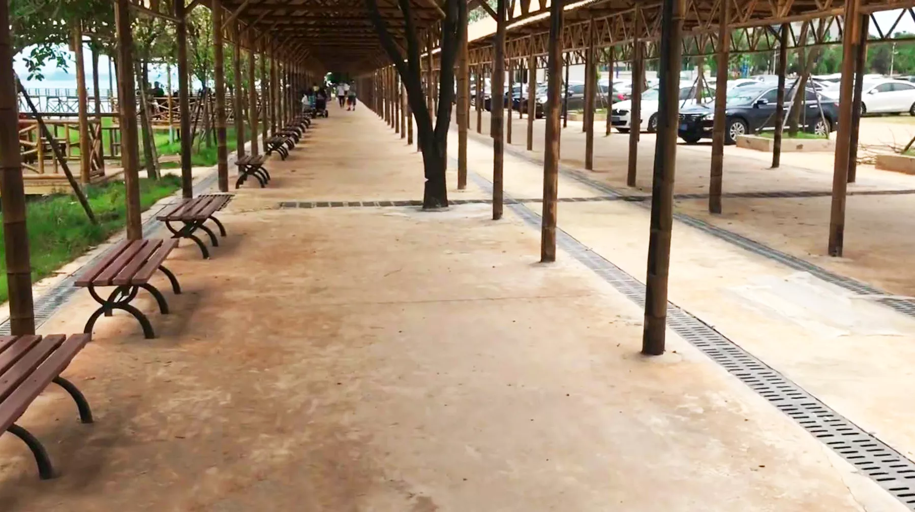 自駕前往梁子湖度假村的交通非常便捷,在武漢城區(qū)四環(huán)線、繞城高速以南接壤江夏區(qū)域下,轉(zhuǎn)到梁子湖大道上向南駛出即可。由于遠離城區(qū),梁子湖大道的交通非常順暢,直行終點后根據(jù)路牌提示入度假村停車場。度假村的范圍還是比較大,里面食宿都很方便,作為驢友關(guān)注的沙灘浴場位置也可以很快找到。浴場建在湖區(qū)水岸邊,遠遠看到一排檐廊,木制屋頂,通透四邊,還有低矮的長椅,看著有點遮風(fēng)避雨的印象,實際是供游客躲避陽光暴曬。坐在長廊里,近距離就能看到不遠處的湖區(qū),那一派煙波浩渺之感,真的有幾分海洋的觀感。