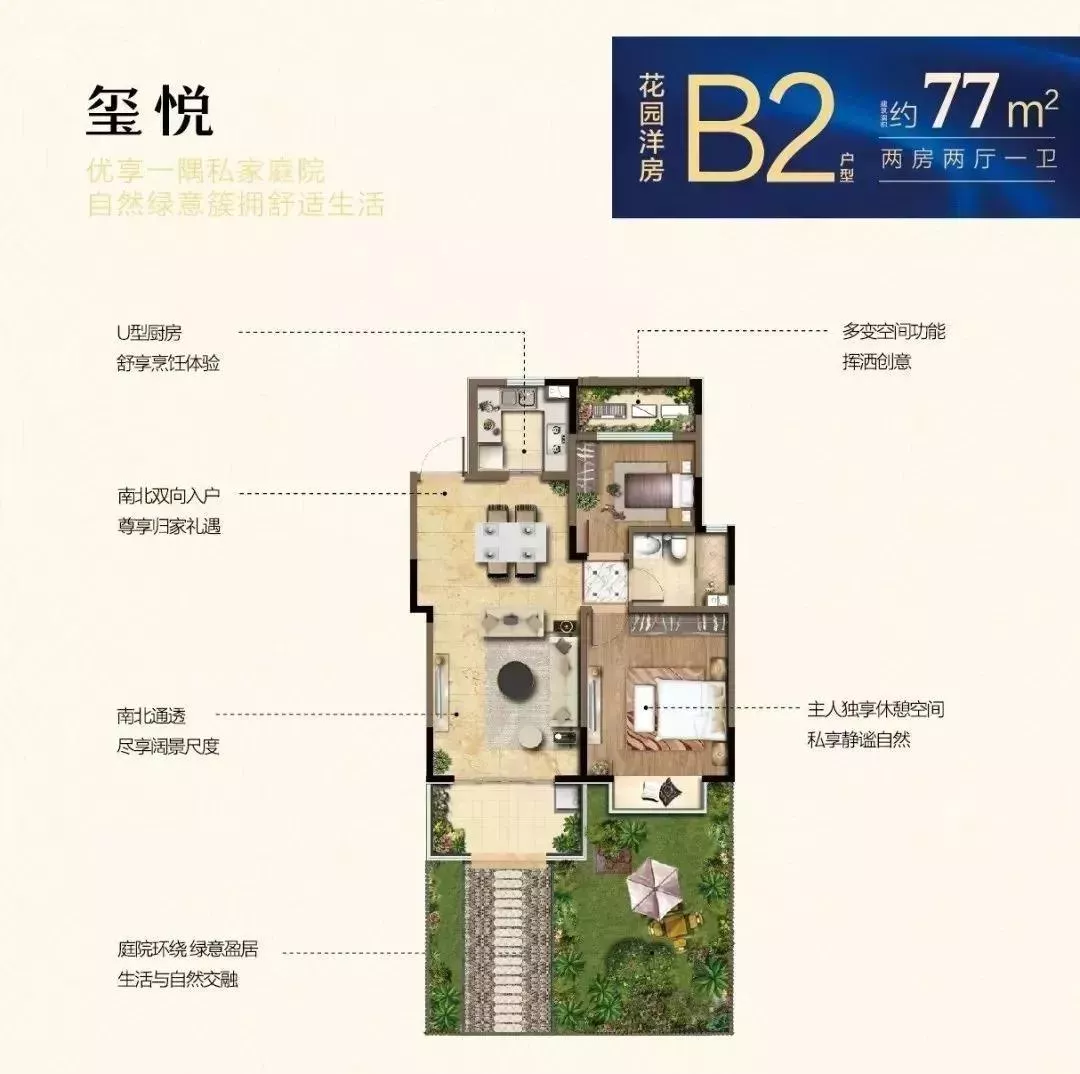 在廚房以客廳之前,我們有個開放式中庭,中庭的西側(cè)連接著您的私家花園,交房后可以改裝成陽光餐廳、花園等;
