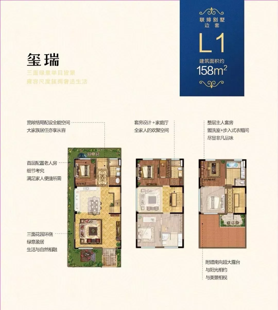 邊套別墅擁有三面花園,花園面積約100㎡左右(中間套只有前后花園),可以隨心布置,也可以為老人、孩子共同打造一個屬于自己的小天地。