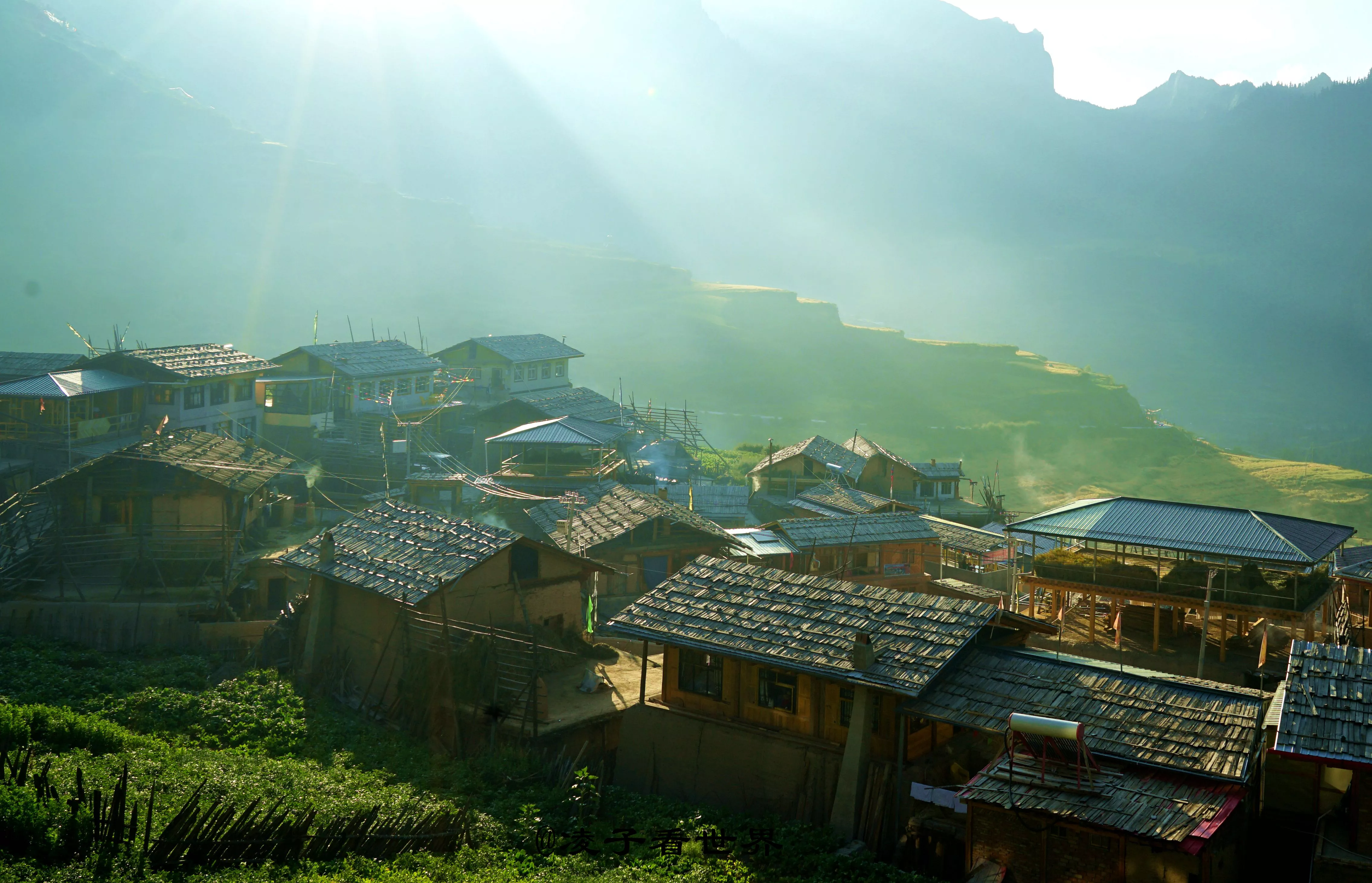 晚上我們?nèi)胱‰x這里不遠(yuǎn)的攝影者之家,這里應(yīng)該是新建不久的一個(gè)酒店。環(huán)境很好,干凈整潔。早晨我們?cè)缭缙饋碲s去拍扎尕那的日出,因?yàn)榇蠹矣X得先天下午的時(shí)間太倉促,沒有好好地欣賞這里。清晨的扎尕那更像一個(gè)戴著面紗的少女,靜靜的沐浴在薄霧晨曦中,一縷縷的霞光撒向她那婀娜的身姿,等著陽光慢慢揭開它羞澀的面紗。在陽光下,遠(yuǎn)山就像洗過一樣,歷歷在目,青翠欲滴,看上去好像離眼前近了許多,也陡峭了許多。俯瞰足下,油菜滿地金黃,環(huán)視群峰,云霧繚繞,一個(gè)個(gè)山頂探出云霧外,靈秀而神秘。