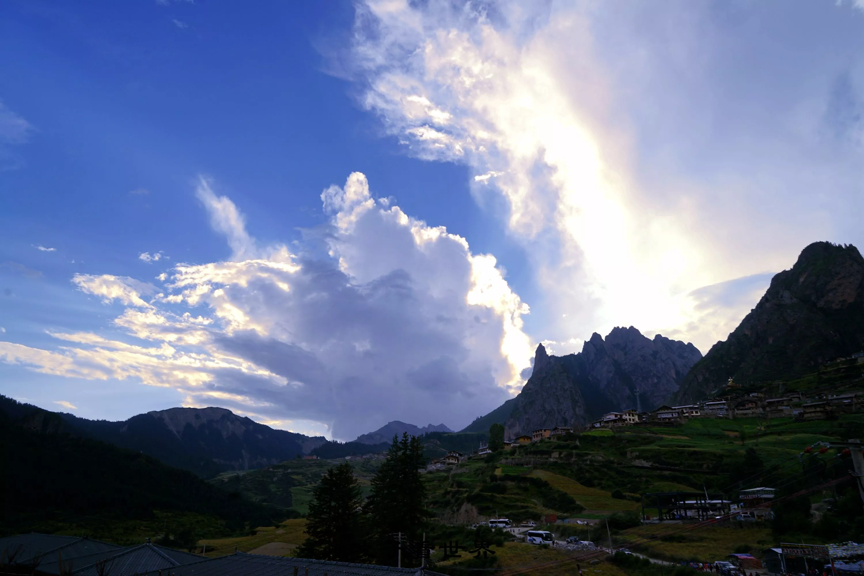 我們趕在黃昏之前進(jìn)到村子里,尋一塊最佳觀景地,想在夕陽落下之前一覽扎尕那的迷人風(fēng)姿。夕陽散在巍峨的山峰上,霎時(shí)峭壁生輝,滿山蒼翠,掩映著遠(yuǎn)處的山寨,滿山金黃的油菜正是到了收獲的季節(jié),與這湛藍(lán)遼闊的天空,縹緲的幾縷云恰好匯成了一幅雅趣盎然的濃烈山水畫卷。