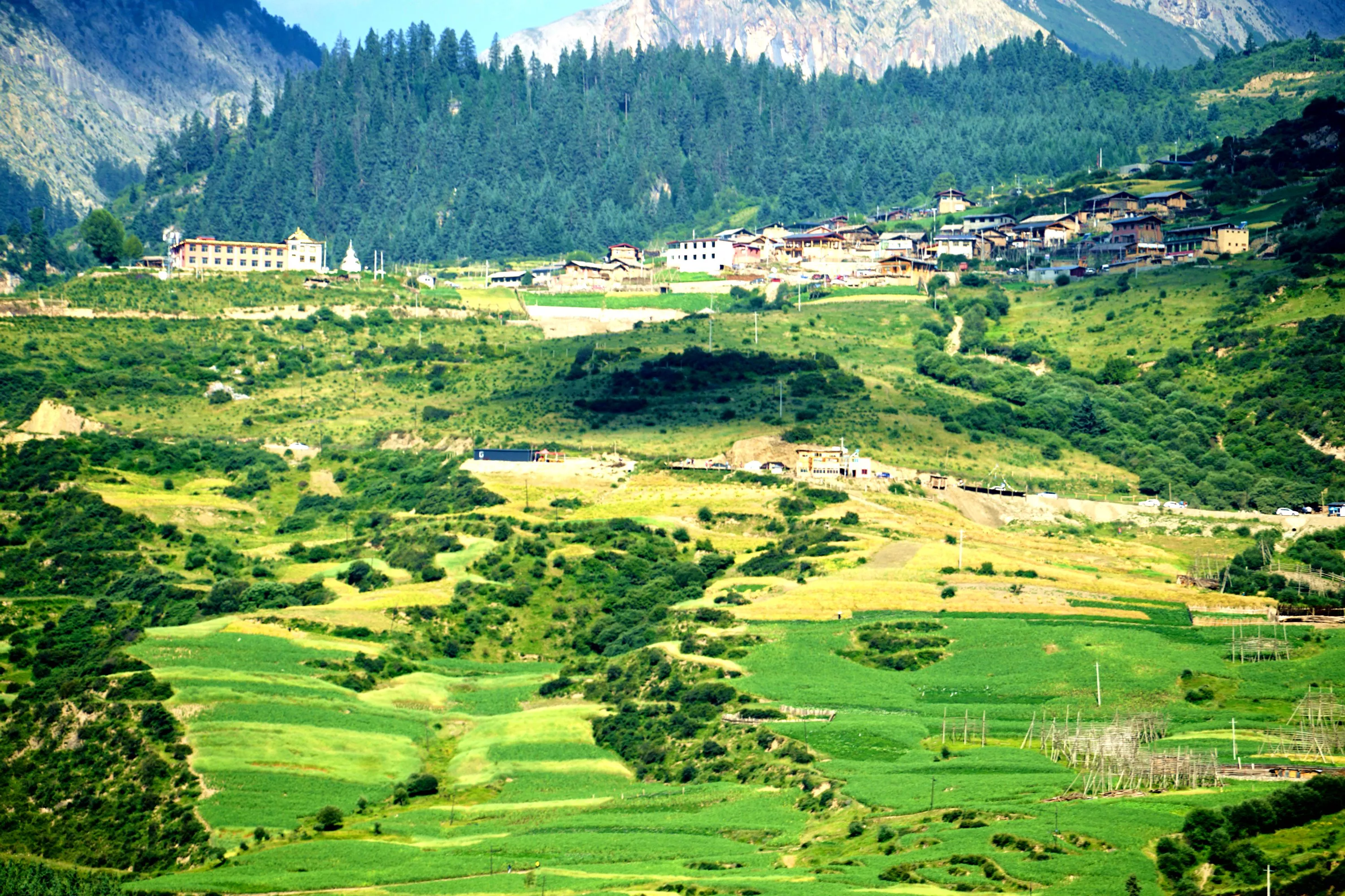 這里一點(diǎn)都不比瑞士差,所以建議想去瑞士的朋友還是先來這里吧。就在來扎尕那的路上那風(fēng)景簡直就是無法讓人相信,只可惜我們由于時(shí)間關(guān)系沒有停下來拍幾張照片。一路上就像在峽谷中穿行,兩邊的山蒼松翠柏,奇峰峻嶺,不時(shí)會(huì)有幾戶人家散落其中。給人一種與世隔絕,唯我獨(dú)尊的意思。這叫什么,世外桃源??!無憂無慮,屋前栽花,房后種田,不思煩惱,牧馬喂羊,悠哉悠哉!