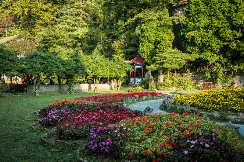 因第四紀(jì)冰川作用,錦繡谷這塊面向西南的山間凹地,經(jīng)過冰川的反復(fù)刻切,形成了一個(gè)平底陡壁的山谷?!按簳r(shí)雜英百千種,燦爛如熾,至冬初蒼翠不剝,丹楓綴之,亦自滿眼雕繢?!彼臅r(shí)紅紫匝地,花團(tuán)錦簇,故名錦繡。