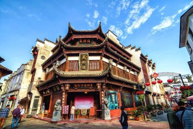 萬粹樓坐落在黃山腳下的屯溪老街,這條有著悠久歷史的老街,保持著宋代風(fēng)貌,以其獨(dú)特的徽派建筑,吸引著眾多的國內(nèi)外游客。在這繁華的老街上,一座高二十四米,上下共四層,占地面積五百多平方米的萬粹樓,拔地而起,雕梁畫柱,飛檐翹角,集木雕、磚雕、石雕為一體,古料新建,匠心獨(dú)運(yùn)。