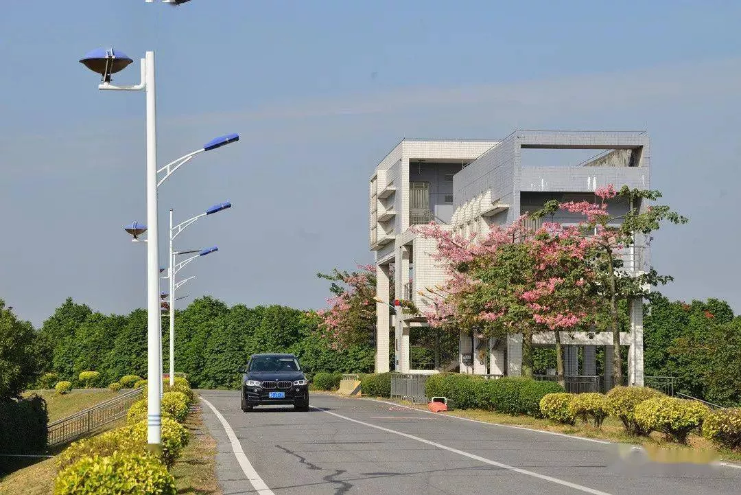 道路上,微風(fēng)吹拂,花瓣如雨婆娑灑落