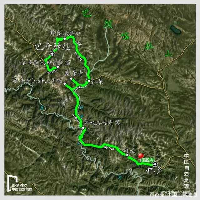 第四天線路:巴干鄉(xiāng)驛站 → 20.1km → 尕朵覺沃神山正面 → 81.5km → 賽康寺→ 13.6km → 尕朵覺沃神山背面 → 30.4km → 卓木其古村落→ 69.1km → 稱多