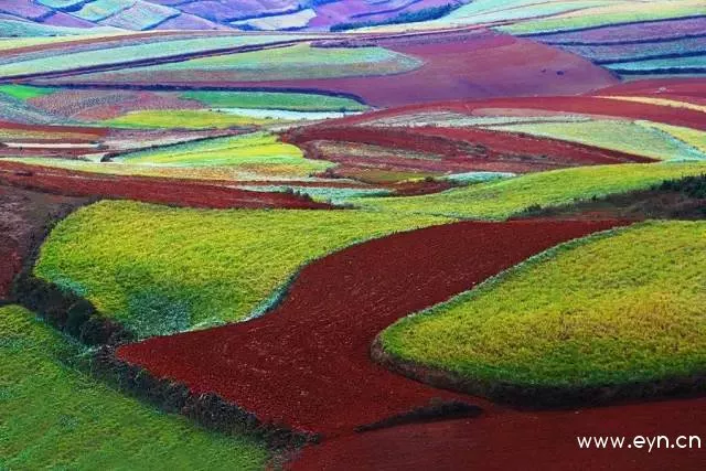 東川的紅土地?fù)?jù)說是世界上僅次于巴西里約熱內(nèi)盧紅土地而更具觀賞性的人文自然景觀。據(jù)資料介紹,紅土地的成因是由于云南省大部分地區(qū)屬亞熱帶和熱帶氣候,加之海洋沉積的“喀斯特”地貌,因而使土壤呈現(xiàn)殷紅和赭紅色。千百年來,這里的人民在紅土地上開墾耕作,每家每戶在自家地里隨意地種植著小麥、馬鈴薯、油菜等不同品種的農(nóng)作物。久而久之,這種隨意的耕作卻造就了今天色彩斑斕的東川紅土地。在每年不同的季節(jié)里,影友們都能在這里收獲到不同的美景。