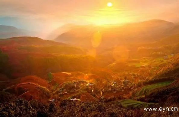 落霞溝為深山谷里的山梁,兩側(cè)是高聳的大山,山谷之中凸顯出一塊高地。落霞溝也叫陷塘地,是崇山環(huán)抱中突然下陷的一塊洼地,16:30-17:30的光線最好。它是東川紅土地觀賞日落的最佳地點(diǎn)。每年秋季也是看日出日落的最佳時(shí)間。霞光穿透云層,毫不吝嗇地灑在紅土地之上,正好照亮了山坡上的一個(gè)村落,宛若天堂之景。太陽從落霞溝東面的山上升起,多云天有可能出現(xiàn)電筒光,適合拍日出日落。 不同的季節(jié),落霞溝會(huì)呈現(xiàn)出不同的美景,恍如人間仙境。
