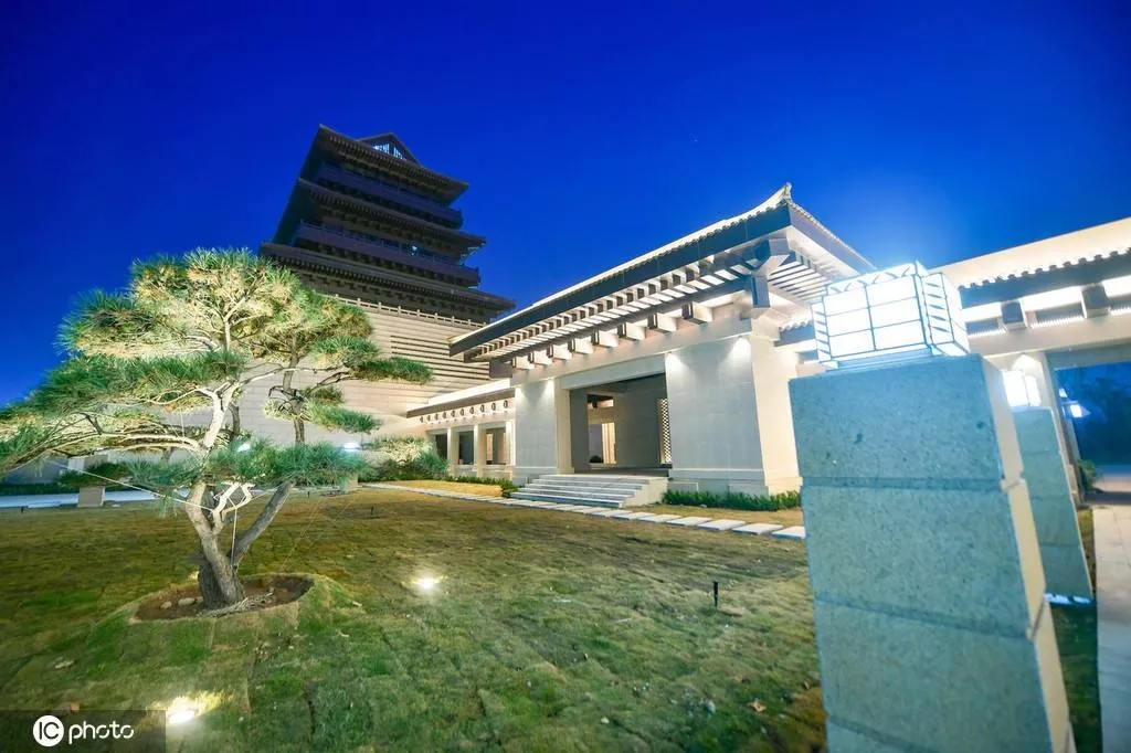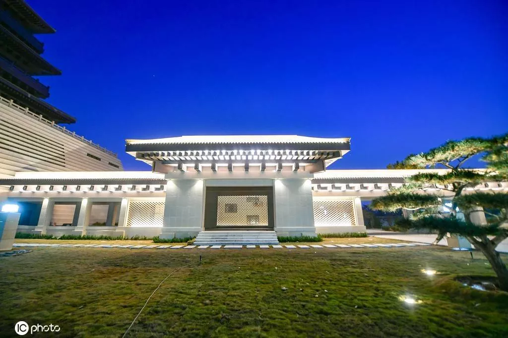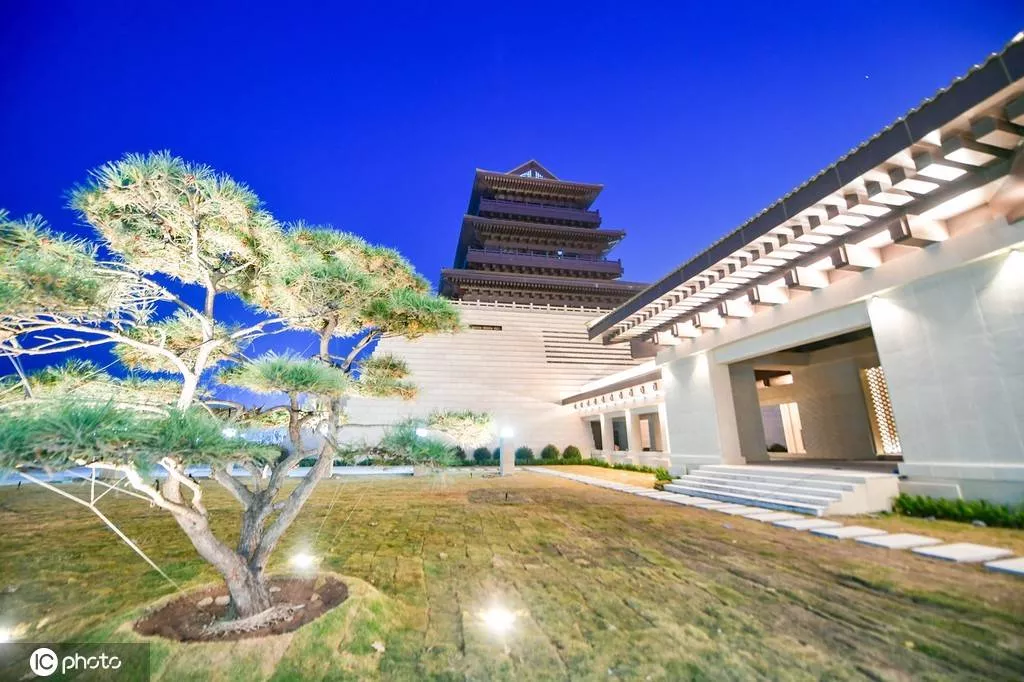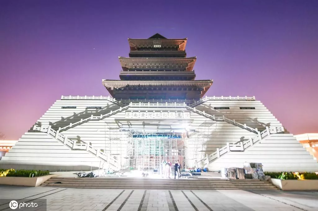 山東濟(jì)南新建黃河文化展覽館,夜晚亮燈凸顯漢唐韻味。