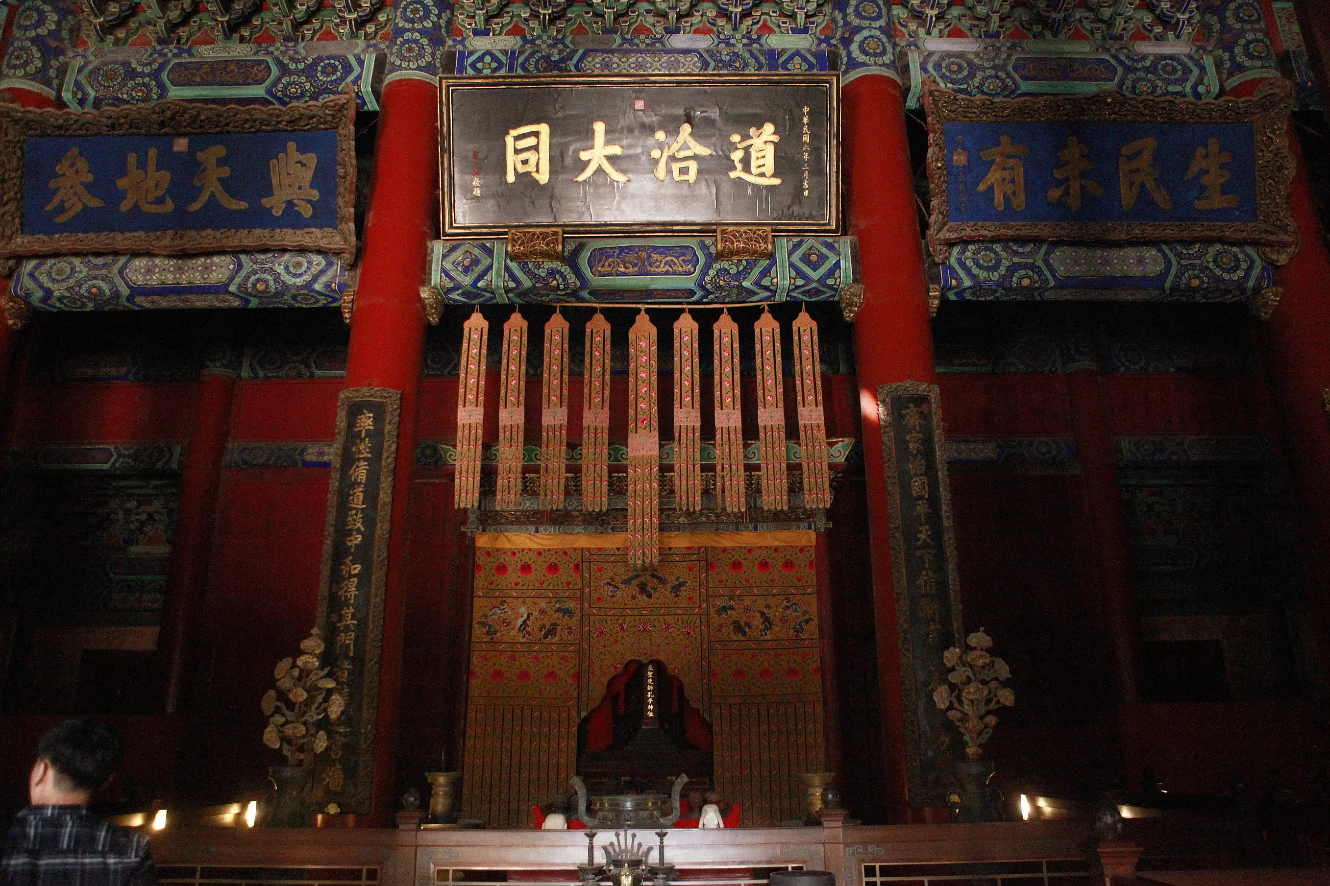 大成殿是孔廟的主要建筑,也是整座孔廟的中心建筑,紅墻黃瓦的殿頂,堪與故宮太和殿相媲美?;实奂漓肟鬃优e行典禮的時候,就在殿前的院落上舉行,殿內(nèi)主座設(shè)置有孔子畫像及其神牌位。不過,現(xiàn)在這里已經(jīng)是首都博物館的一部分了。