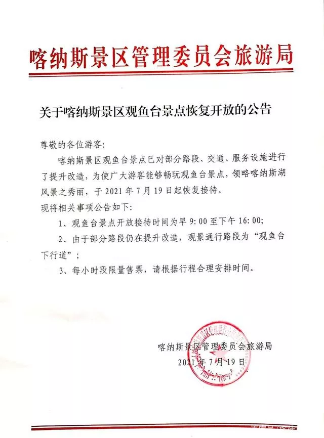 喀納斯景區(qū)觀魚臺景點已對部分路段、交通、服務設施進行了提升改造,為使廣大游客能夠暢玩觀魚臺景點,領略喀納斯湖風景之秀麗,于2021年7月19日起恢復接待。