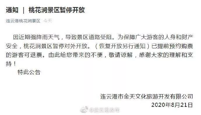 通知 【連云港桃花澗景區(qū)暫時(shí)關(guān)閉】據(jù)氣象部門預(yù)報(bào),11-12日我市將有一次強(qiáng)降水和大風(fēng)天氣過程,根據(jù)《連云港市防指關(guān)于做好防范強(qiáng)降雨工作的緊急通知》,為保障游客生命財(cái)產(chǎn)安全,2020年7月11日-12日桃花澗景區(qū)暫時(shí)關(guān)閉,已提前預(yù)約購票的游客可退票。via.連云桃花澗景區(qū)