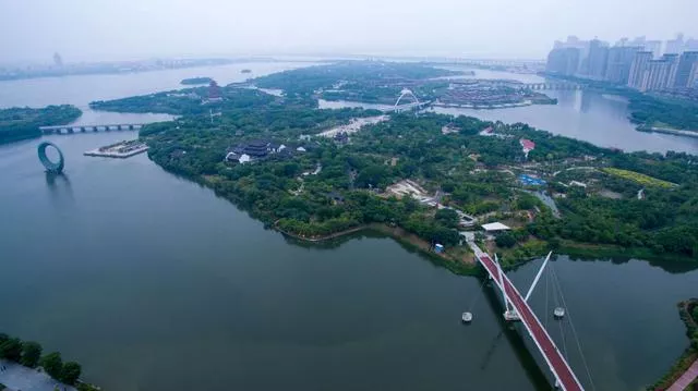 眾多島嶼由16座橋梁相互連接,形成了獨(dú)一無二的園在水上、水在園中的“水上園博園”。