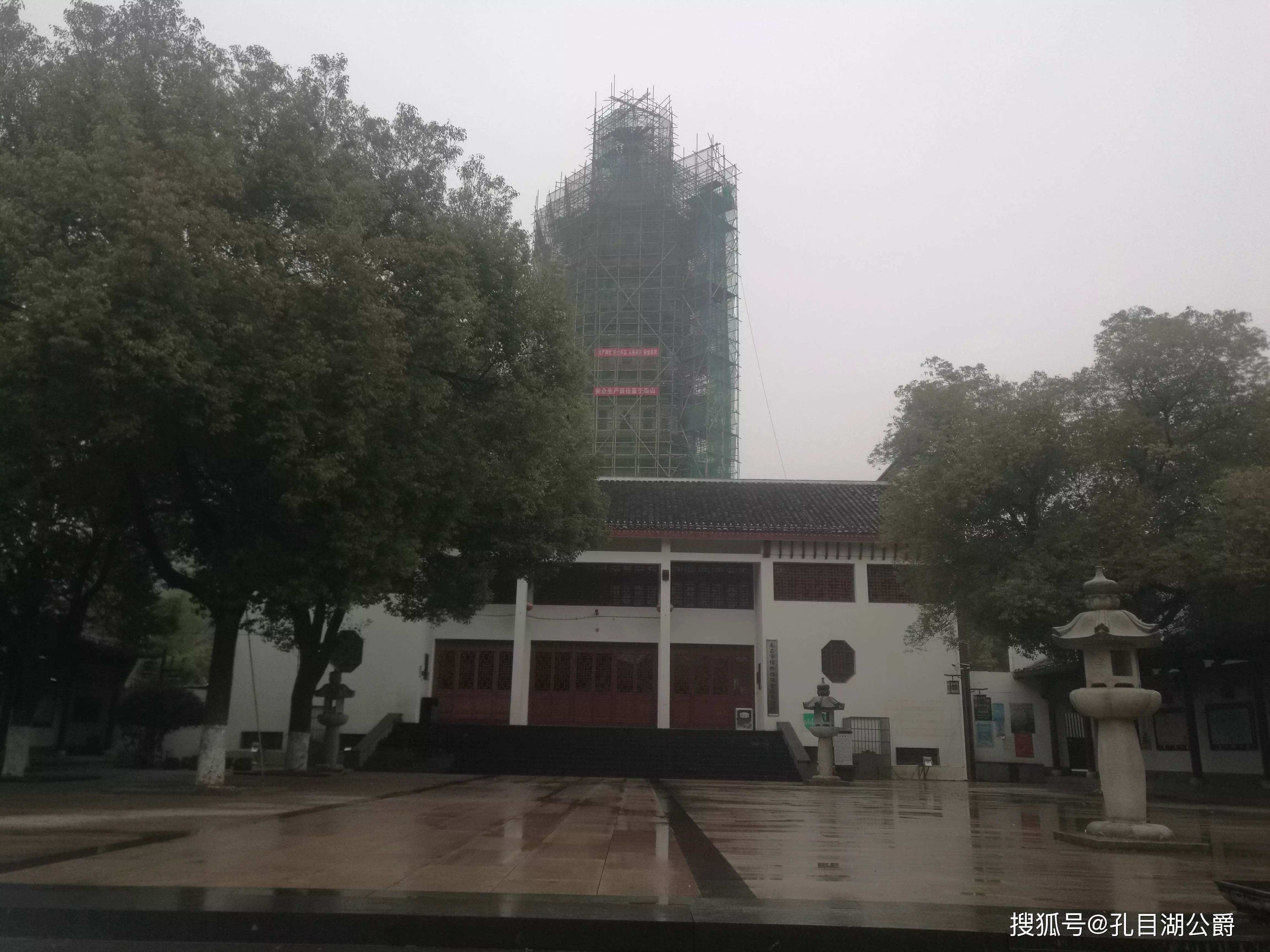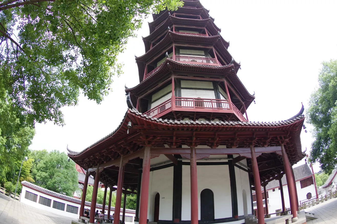 繩金塔始建于唐天祐年間,相傳建塔前異僧惟一掘地得鐵函一只,內(nèi)有金繩四匝,古劍三把(分別刻有“驅(qū)風(fēng)”、“鎮(zhèn)火”、“降蛟”字樣)還有金瓶一個,盛有舍利子三百粒,繩金塔因此而得名。至于塔身為中國江南典型的磚木結(jié)構(gòu)樓閣式塔,塔高50.86米,塔身為七層八面(明七暗八層)內(nèi)正外八形,其朱欄青瓦,墨角凈墻及鑒金葫蘆型頂,有濃重的宗教色彩。