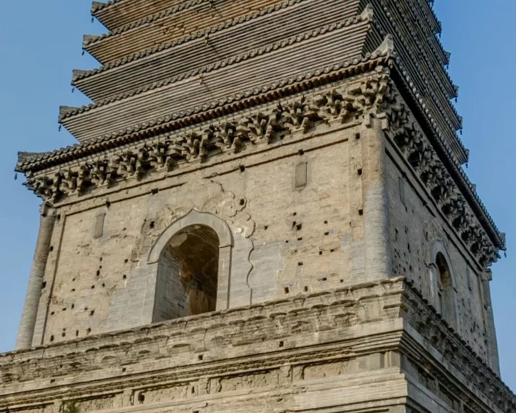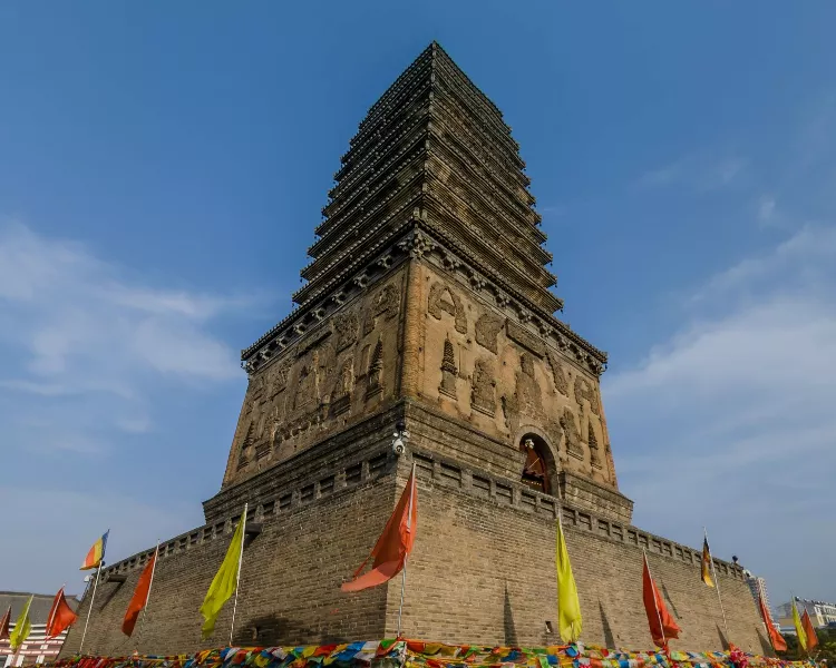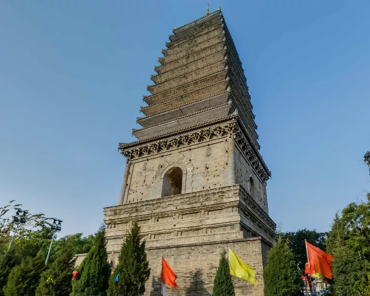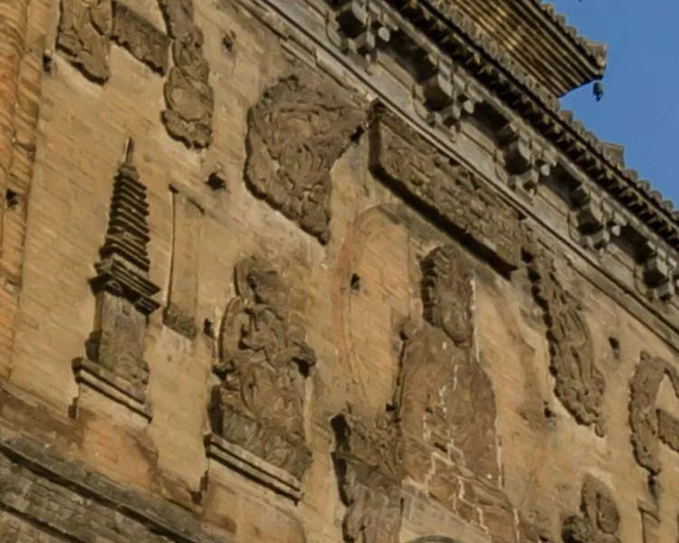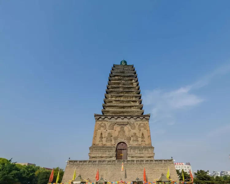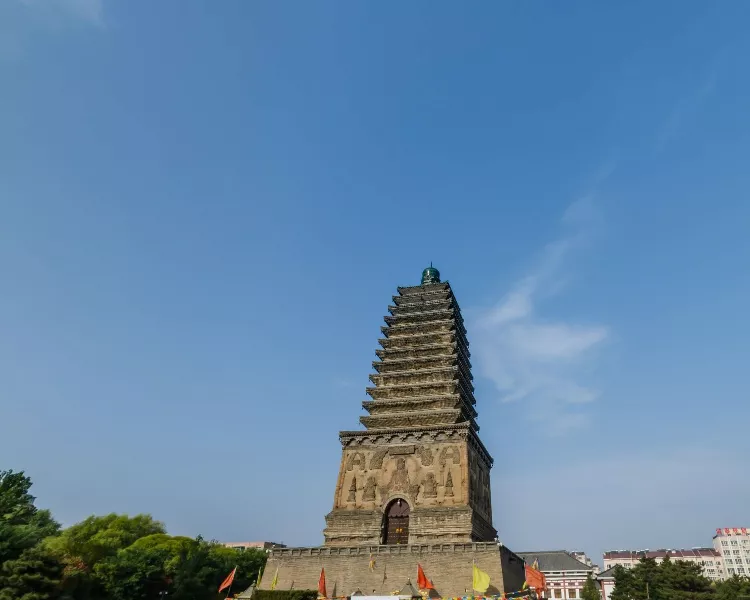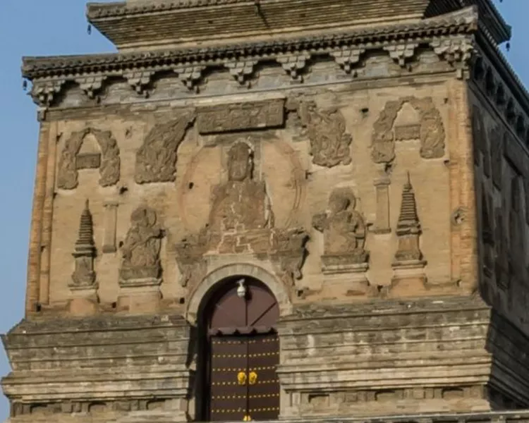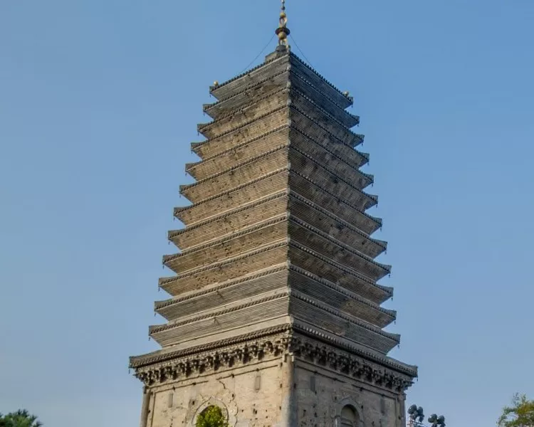 北塔高38.7米,是一座空心十三級密檐式磚塔。北塔四面刻著栩栩如生的佛像,佛塔,佛碑,佛光普照!