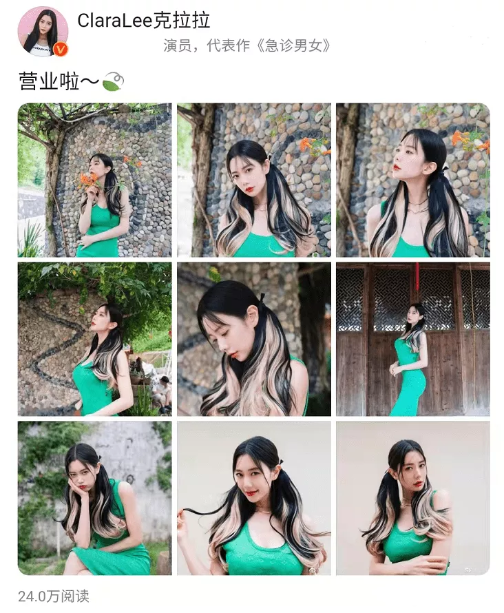 這一次克拉拉總共曬出來的九張照片,在這九張照片中,克拉拉穿著同一件衣服,造型基本上都是一樣,克拉拉穿著一件淺綠色的連衣裙,扎著雙馬尾,造型看起來格外的清爽,整個(gè)人也顯得很洋氣,無論還是連衣裙還是雙馬尾辮,都顯得克拉拉格外的稚嫩,看起來像少女一樣。