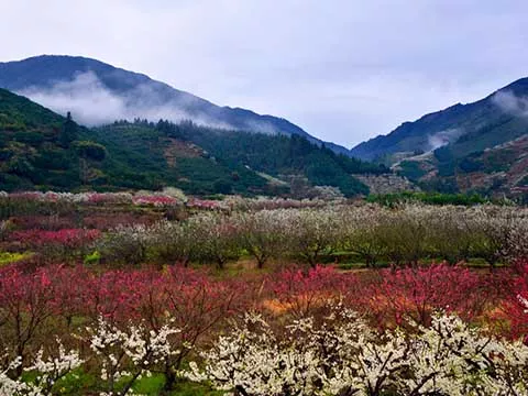 廣東樂(lè)昌市九峰鎮(zhèn)一直養(yǎng)在深閨無(wú)人識(shí),這幾年才被戶外驢友發(fā)掘出來(lái),被稱為“廣東粵北最美村莊”。它位于粵北高寒山區(qū),平均海拔1000米,晝夜溫差大,特殊的氣候造就了九峰優(yōu)美的自然生態(tài),是天然綠色水果的優(yōu)良產(chǎn)區(qū)?!叭ツ杲袢沾碎T中,人面桃花相映紅”,每當(dāng)春暖花開時(shí)節(jié),擁有6萬(wàn)畝果園的“水果之鄉(xiāng)”九峰山上的桃花梨花,李花,油菜花,開始爭(zhēng)相怒放,成為花的海洋。這里處處呈現(xiàn)春色盎然的景象,大紅的、粉紅的桃花、雪白的梨花和李花還有黃澄澄的油菜花,他們相互襯托,別有一番景色、美不勝收。
