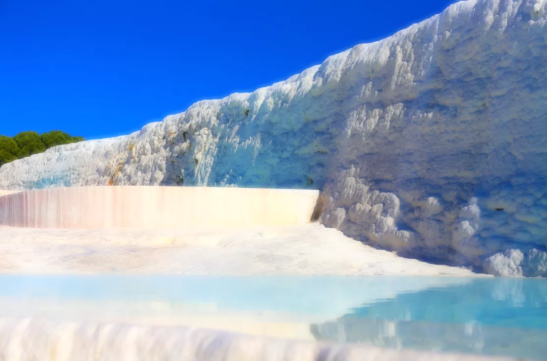 遠(yuǎn)處奶白色的鐘乳層層疊疊,結(jié)聚成棉花狀滾滾而下。一邊泡著溫泉,一邊欣賞位于棉花堡下的棉堡鎮(zhèn),慵懶中體味一絲高雅!