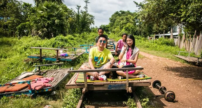 竹火車就是從坦克車上卸下來四個輪子,然后把輪子旱成農(nóng)村架子車上的那種輪子,然后兩組放在鐵軌上,輪軸上面再放一張竹席,這就是簡單的竹火車了。這種交通工具特變簡單,使用汽車的發(fā)動機(jī)作為動力,力氣還是蠻大的,可以運(yùn)載8頭牛,40多人呢,所以在當(dāng)時(shí)這是重要的交通工具,旺季的時(shí)候同時(shí)有上千輛竹火車在同時(shí)運(yùn)營。