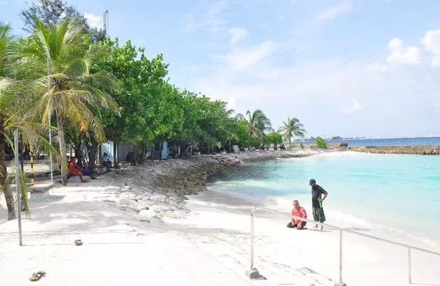 為了防洪,馬累全島被防波提跟消波塊圍繞,只有東側(cè)的人造海灘能感受熱浪。周邊有快餐店、咖啡廳、餐廳,當(dāng)?shù)厝私Y(jié)束一天的工作大多都會來這里享受放松的氣氛,美景跟海風(fēng)。由于宗教信仰,在人造海灘上,沒有比基尼也沒用泳裝,旁邊還有不定期舉辦球賽的廣場。