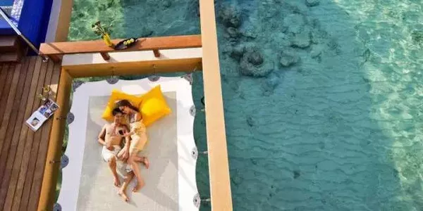 在陽(yáng)光明媚的水域上享受曼妙時(shí)光。 探索修建在水中高柱之上的雙層別墅,在無(wú)邊泳池中暢游,慵懶地躺在海上吊床上沐浴日光,或在屋頂涼亭內(nèi)享受 Spa 護(hù)理,您可隨心選擇鐘愛(ài)之事。 陽(yáng)光透過(guò)一排玻璃墻和玻璃門從各個(gè)角度射入別墅內(nèi),絢麗多彩的內(nèi)飾家具為神奇的海島水上生活注入活力氣息。