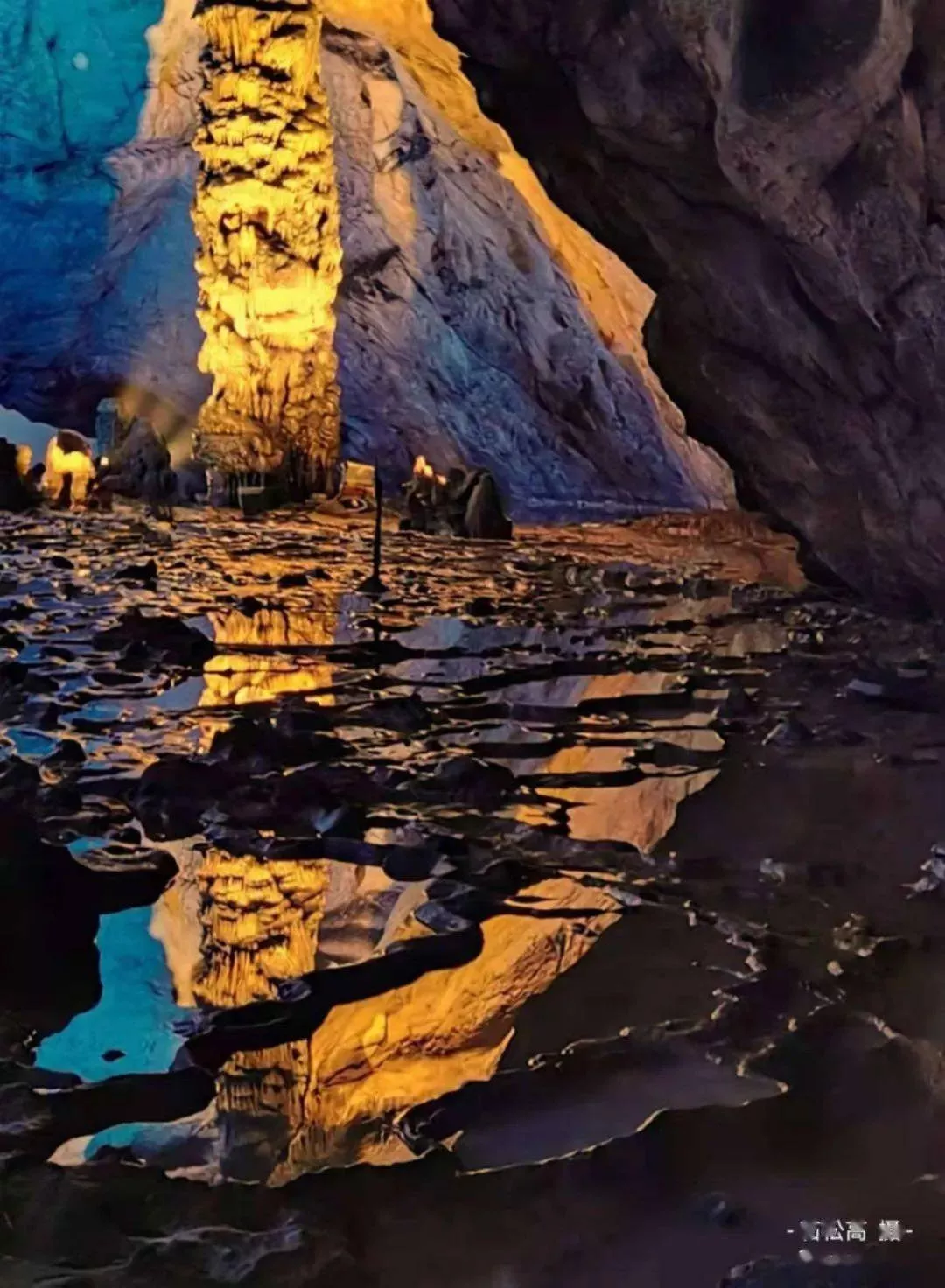 鐘乳石和燈光、水面交錯(cuò)縱橫,構(gòu)成了美麗畫卷