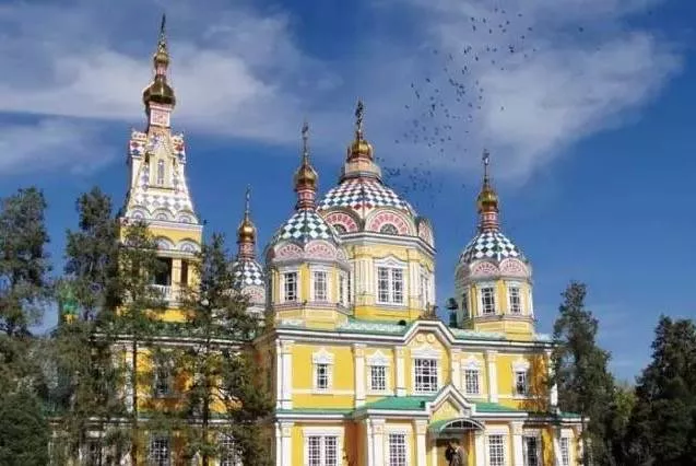 公園中間有一座俄羅斯風(fēng)格的東正教教堂—津科夫大教堂,據(jù)說是世界現(xiàn)存的第二高木結(jié)構(gòu)建筑,沒有使用一根釘子,始建于1907年沙俄時代,是阿拉木圖1911年大地震后僅存的建筑。教堂的外墻顏色是嫩黃色的,各種色彩把整個教堂裝飾得金碧輝煌。