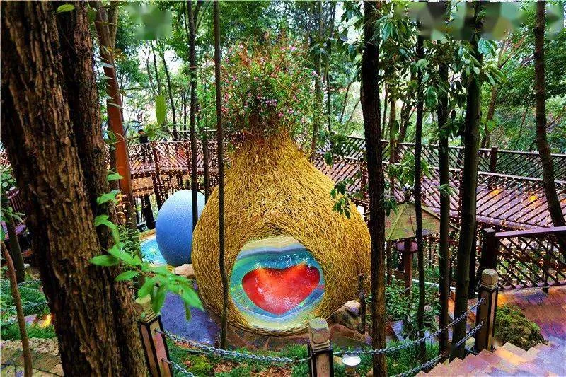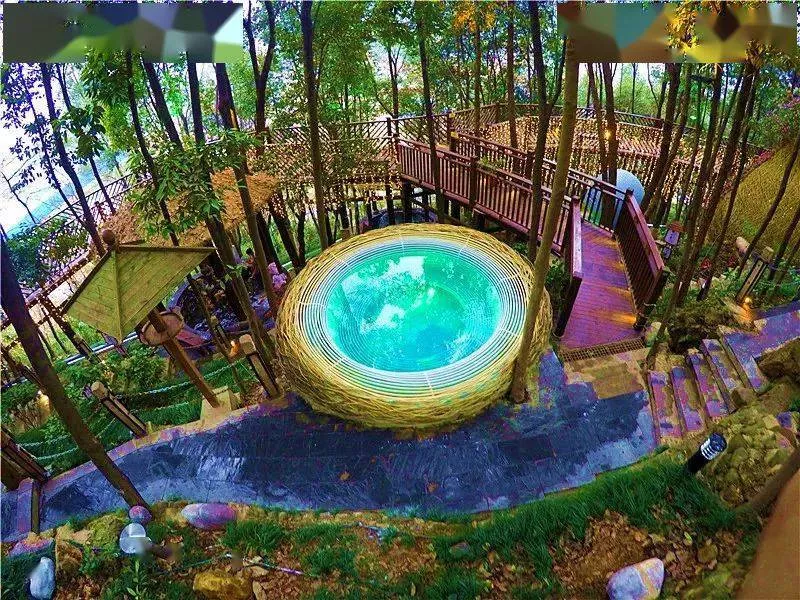 充滿地礦地?zé)嵘实亩嗖束B(niǎo)巢溫泉泡池像一顆綠藍(lán)寶石鑲嵌在森林之中