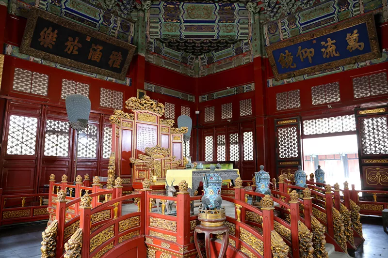 殿內(nèi)布置的也非常講究,彩繪的天花頂、桌案、屏風(fēng)、鼎爐一個不少,當(dāng)年皇上就坐在金光閃閃的龍椅上給跪在外面的學(xué)子們講講自己的心得體會?,F(xiàn)在的國家領(lǐng)導(dǎo)們也不時地在大學(xué)里演講,估計這個習(xí)慣就是從這來的。