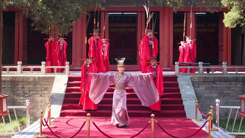 在莊重悠揚的樂曲中,正殿的數(shù)道大門被輕輕推開,時光好像倒流了千年,一群手捧竹簡,頭戴冠巾的儒生們恭敬虔誠的誦讀著流傳千年的”有朋自遠(yuǎn)方來,不亦樂乎“。美麗的少女們,邁著優(yōu)雅的步子,演義了一段靈動曼妙雍容華美的漢代宮廷樂舞。