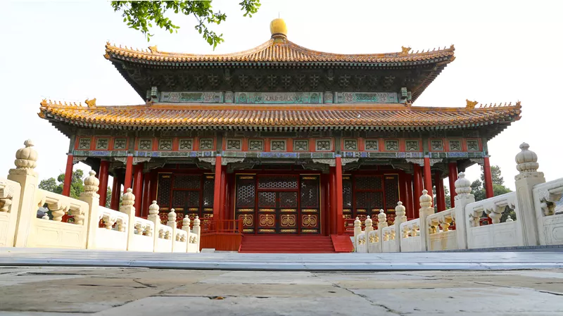 辟雍殿是國子監(jiān)里最壯觀華美的建筑了,是皇帝客串老師給學(xué)生們講課的地方。大殿是正方形,四周環(huán)水,用漢白玉石欄圍成了一個圓,水上東南西北各建一座石橋連接著大殿和院落。