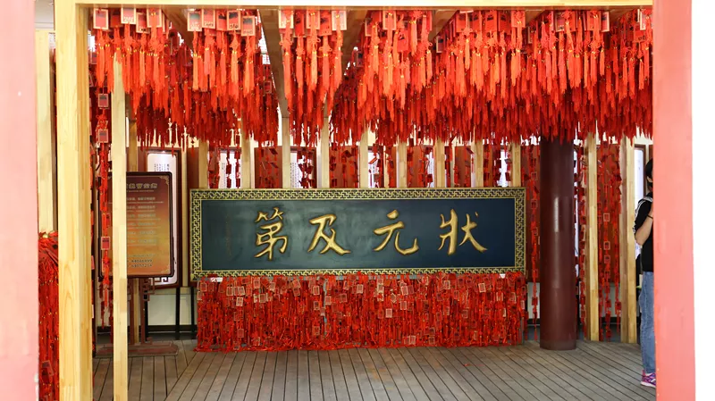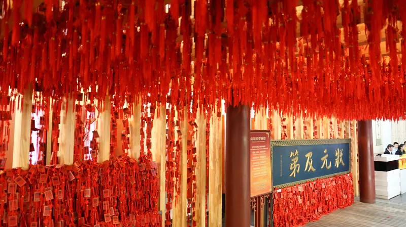 一般父母們逛完國子監(jiān),基本就跟打了雞血一樣,也希望自家孩子能成龍成鳳,“貼心的”商家理解這種無處安放的宏圖大愿,特別在院子左邊開設(shè)了買狀元牌祈愿的大廳。
