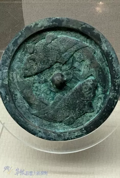 銅鏡,背面有兩只精美錦鯉