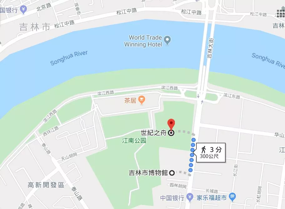 世紀(jì)廣場(chǎng)、世紀(jì)之舟、吉林市博物館、松花江之相對(duì)位置