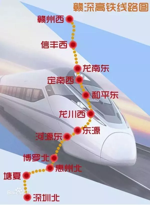 贛深高鐵北起江西贛州市,經(jīng)河源、惠州、東莞市,終于深圳北站,設(shè)計(jì)速度為350公里/小時(shí),建設(shè)工期4年。