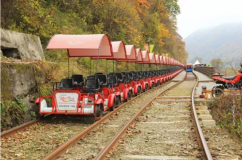(2)江村鐵路公園是利用舊京春線路軌改成的公園,鐵路自行車是韓國的流行玩意,因?yàn)椤禦unning Man》在這里拍攝過,立即成為人氣熱點(diǎn)。 江村鐵路公園全長8.2公里,共有2條路線,其中以金裕貞站至江村站一段最受歡迎,因?yàn)檠赝撅L(fēng)光優(yōu)美,而且多下斜坡,不需花太多力氣已可踩畢全程。 自行車分2人或4人兩種,非常適合親朋好友一起出游玩耍。沿途經(jīng)過大片稻田、山林和河流,彷彿置身于流動的風(fēng)景畫中。 踩至末段要經(jīng)過一條隧道,隧道內(nèi)會播放音樂搭配燈效, 格外有意思。穿過隧道后,就是終點(diǎn)江村站。