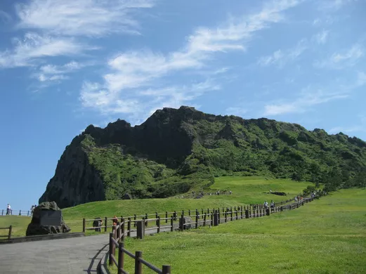城山日出峰:2007年被,城山日出峰被列入世界自然遺產(chǎn),是約10萬年前海底爆發(fā)而形成的火山巖。噴火口上面圍著99塊大石頭,因樣子像一座巨大的城而得城山之名,這里也是看日出的圣地,所以叫做日出峰。