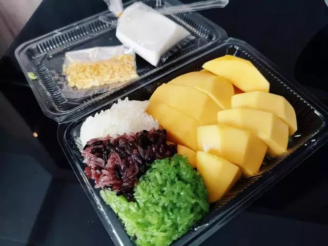 芒果飯有原味和三色,150泰銖一盒,折合人民幣35塊左右;店里沒有坐的地方,只提供打包;芒果現(xiàn)切,綠色紫色的糯米飯使用天然食材萃取染料染制而成,一打開盒子,芒果的香甜味撲鼻而來,非常的新鮮。糯米飯淋上溫?zé)嵋瑵{和綠豆仁,軟糯又不會太粘稠,點點咸味更激發(fā)出芒果的鮮甜,綠豆仁使得口感更豐富,沒有粗纖維的芒果吃起來順滑多汁入口即化,不需要咀嚼便慢慢在口中融化開來。