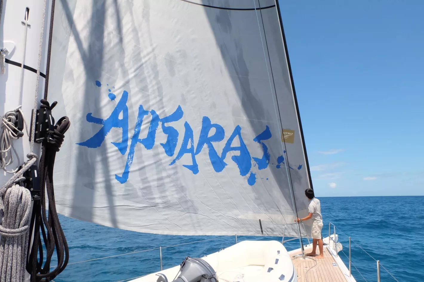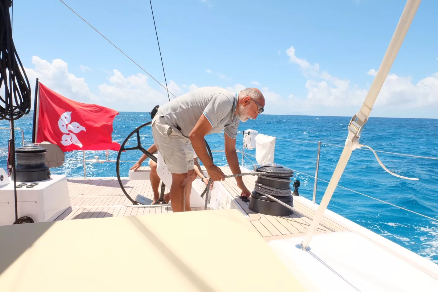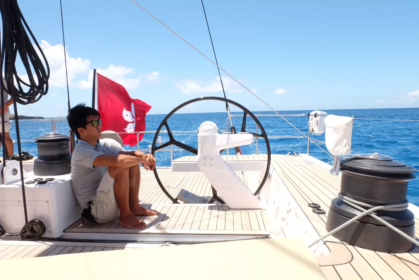 我們有自駕的大帆船,一會安排登船半天的環(huán)島游。天色灰蒙蒙的,估計(jì)一會有可能會下雨,說時(shí)遲,那是快,在去環(huán)島一側(cè)的路上,下起了雨,不過繞了一圈回來時(shí),雨已經(jīng)停了,陽光燦爛。