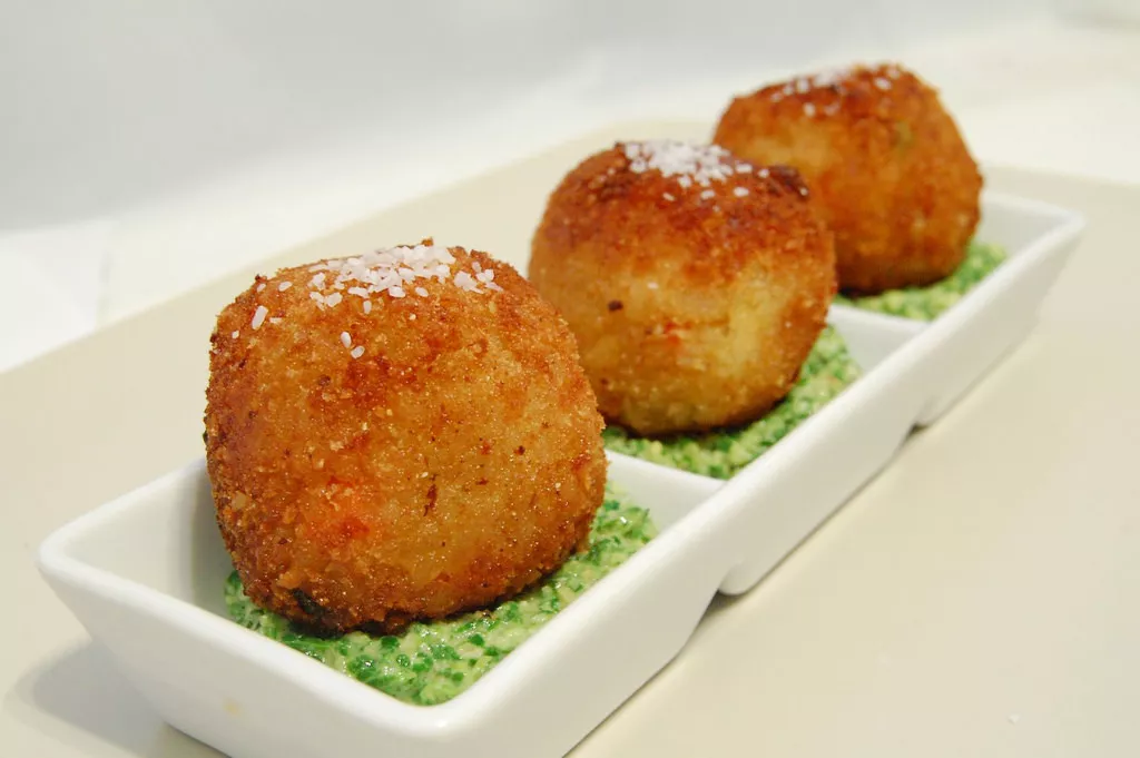 西西里米團就是經(jīng)過油炸后揉成團的意大利調(diào)味飯,傳統(tǒng)的米團里會加入番茄肉醬、火腿和起士。口感豐富卻不混雜,作為小食最適合不過。