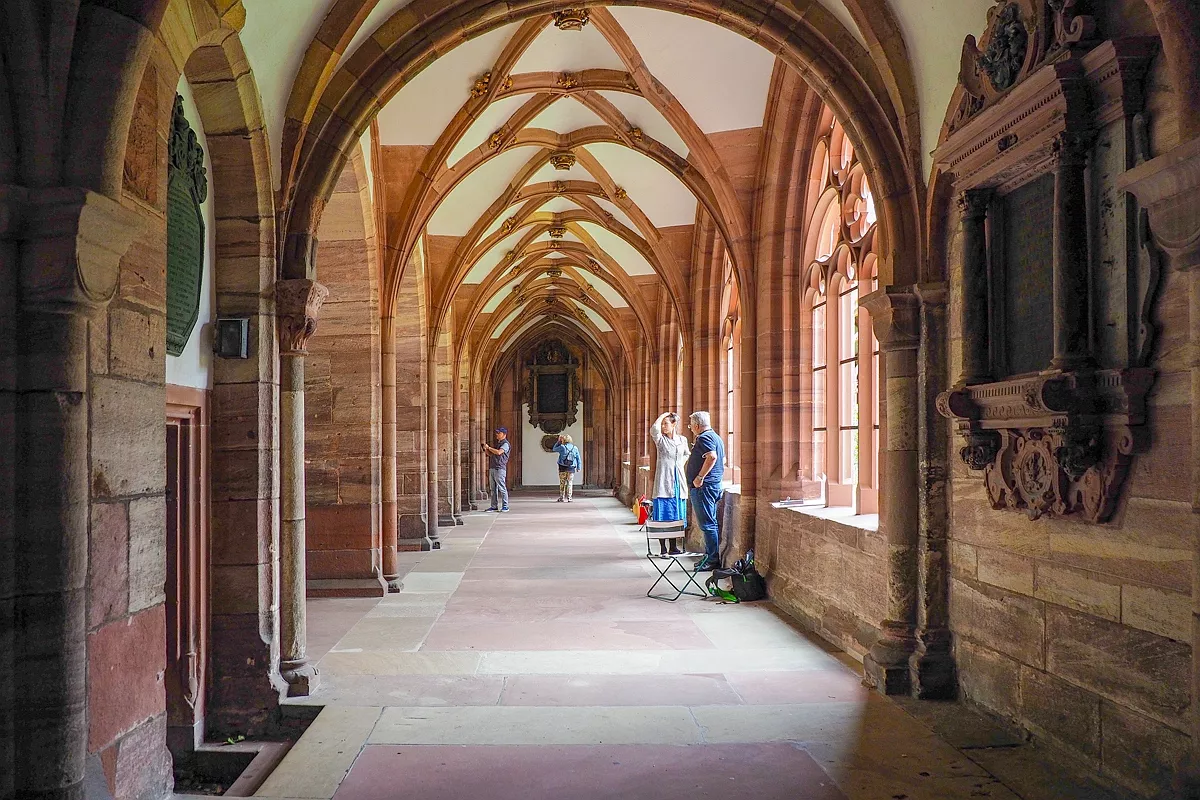 修道院哥特式風格的回廊一層套著一層,四面回廊圍繞著內(nèi)庭,墻面上很多紀念碑徽章,古樸美麗。這里也葬有很多巴塞爾的名人。